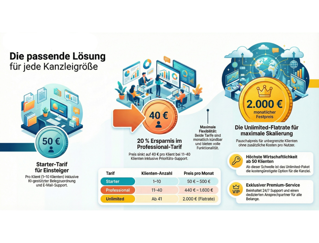 Verwalten Sie unbegrenzt viele Mandanten zum Fixpreis – besonders attraktiv ab 50 Mandanten. Mit 24/7 Premium-Support und Ihrem persönlichen Ansprechpartner konzentrieren Sie sich ganz auf die steuerliche Beratung, während wir die technische Infrastruktur sicherstellen.